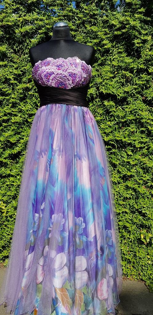 Šifónové šaty vyšívané s černou aplikací v pase.