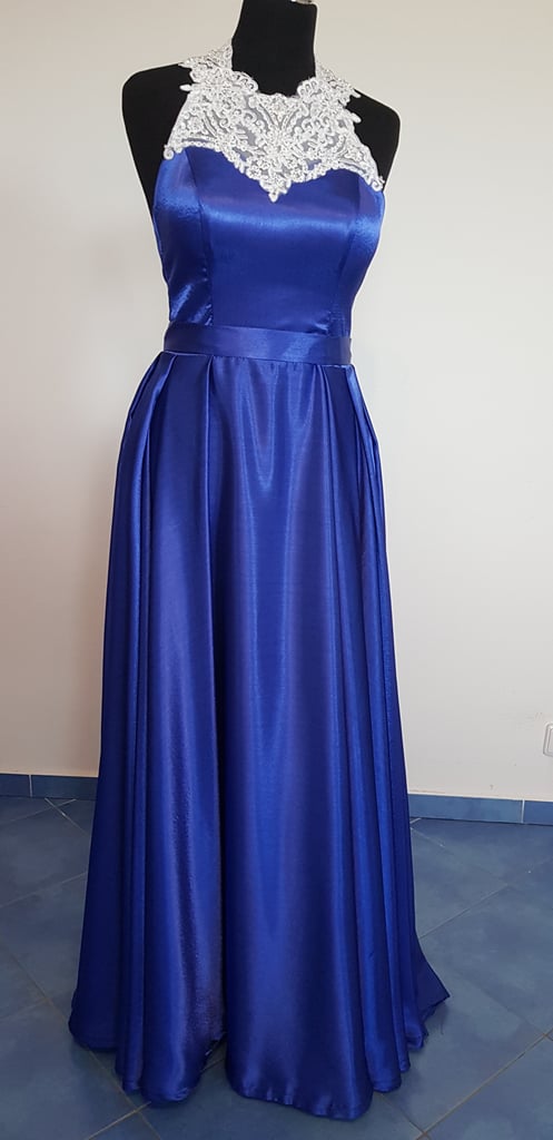 Saténové šaty s bohatou kolovou sukní s vlečkou.