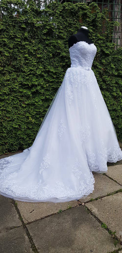 Tylové svatební šaty s bohatě vyšívanou vlečkou.